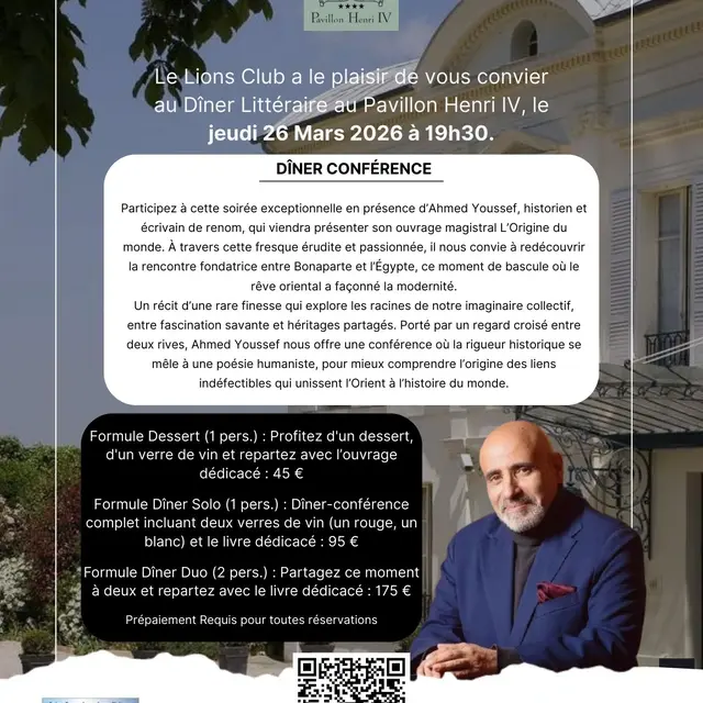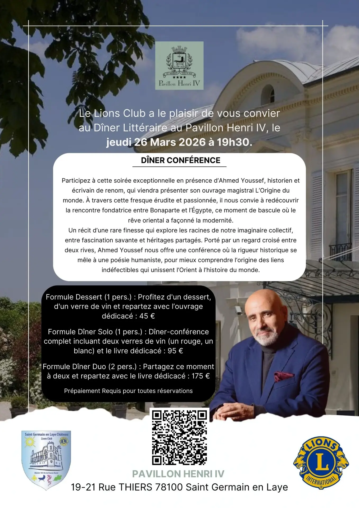 Le Lions Club Saint Germain en Laye Château a le immense plaisir de vous inviter à une soirée littéraire et historique prestigieuse le jeudi 26 mars 2026 à 19h30.