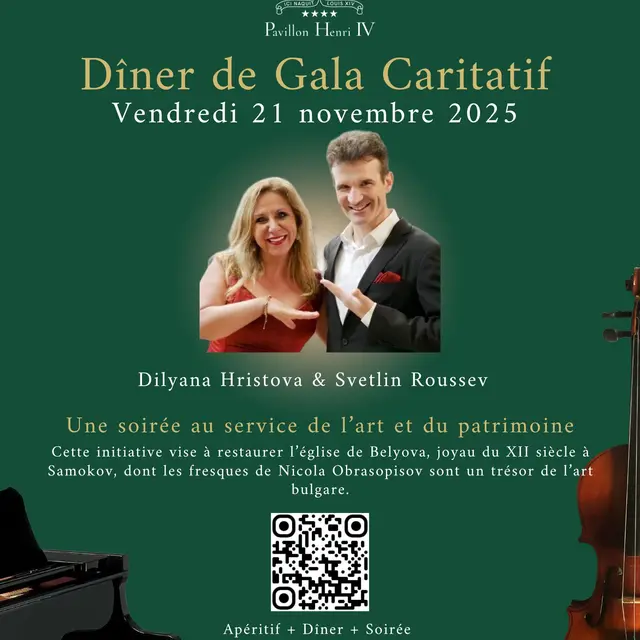 Une soirée d’exception au Pavillon Henri IV, conjuguant patrimoine musical et élégance française. L’événement débutera par un accueil au Champagne dans nos salons avec vue panoramique sur Paris, avant un concert intimiste réunissant le violoniste Svetlin Roussev et la pianiste Dilyana Hristova, deux artistes de renommée internationale.