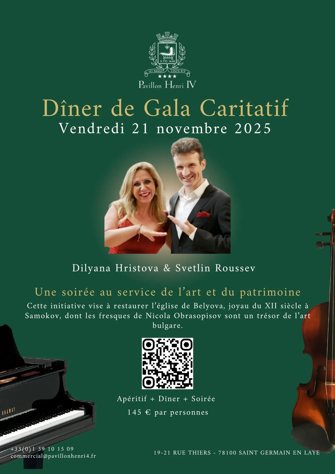Une soirée d’exception au Pavillon Henri IV, conjuguant patrimoine musical et élégance française. L’événement débutera par un accueil au Champagne dans nos salons avec vue panoramique sur Paris, avant un concert intimiste réunissant le violoniste Svetlin Roussev et la pianiste Dilyana Hristova, deux artistes de renommée internationale.